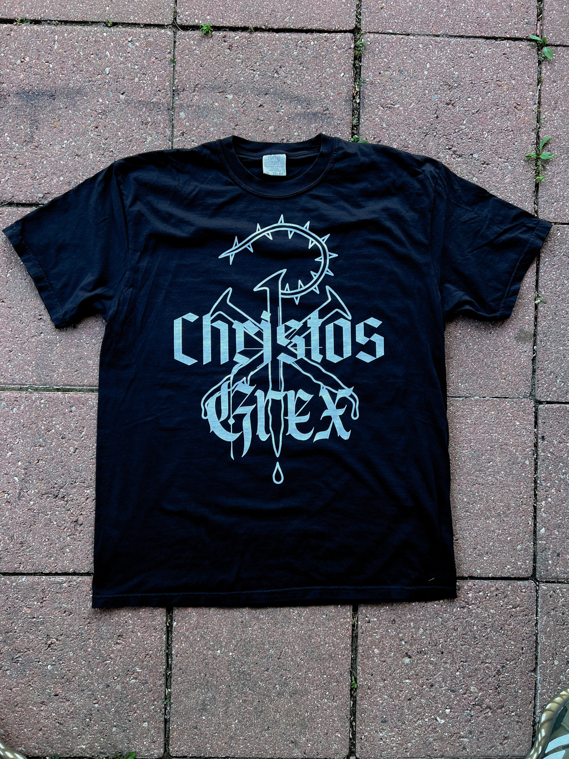 The ancient Chi Rho (XP) symbol — an early Greek monogram for Christ — is reimagined with blood-drip details and a thorn-crowned P, representing His sacrifice. Christos (Greek for Christ) and Grex (Latin for flock) collide to form a bold proclamation: Christ Gang. This design is a banner for those who live — and if necessary, die — for Him. Romans 14:8