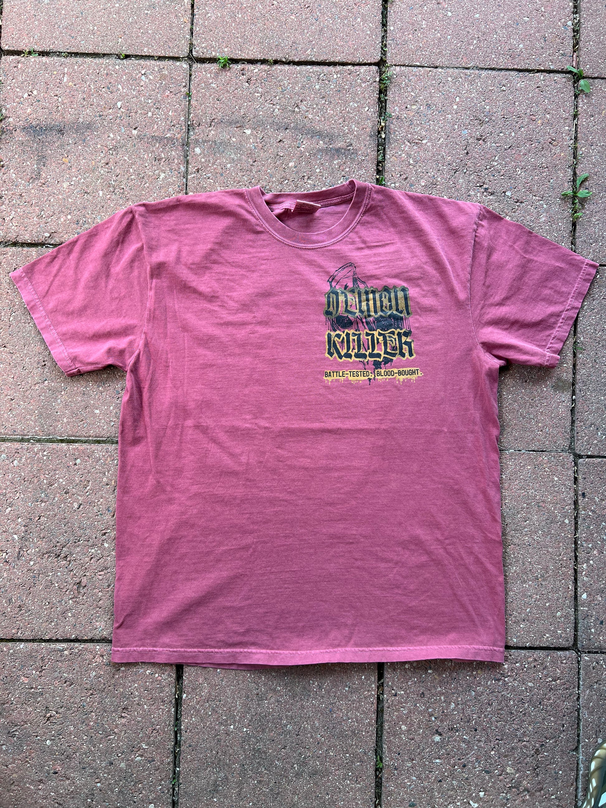 A heavenly warrior, armored and radiant, stands triumphant over a defeated demon — sword in hand, wings spread wide, and halo blazing above. Flames rise beneath the chaos while chains break and darkness trembles. Bold gothic lettering spells out “DEMON KILLER,” capturing the moment divine justice hits the battlefield. Every detail declares: this is more than art — it’s authority.