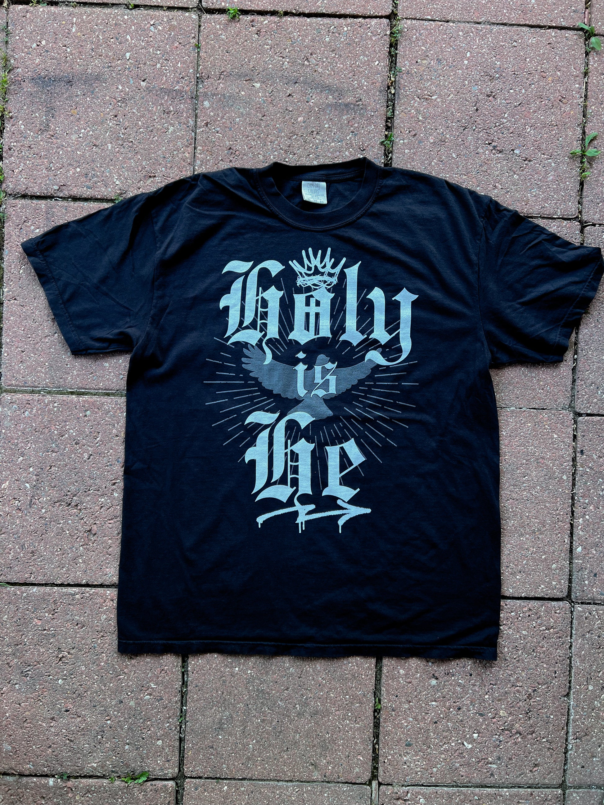This design centers on a crowned dove — symbol of the Holy Spirit — bursting with rays of glory. Gothic script and dripping ink meet heavenly weight, declaring what never changes: He is holy. Always has been. Always will be.