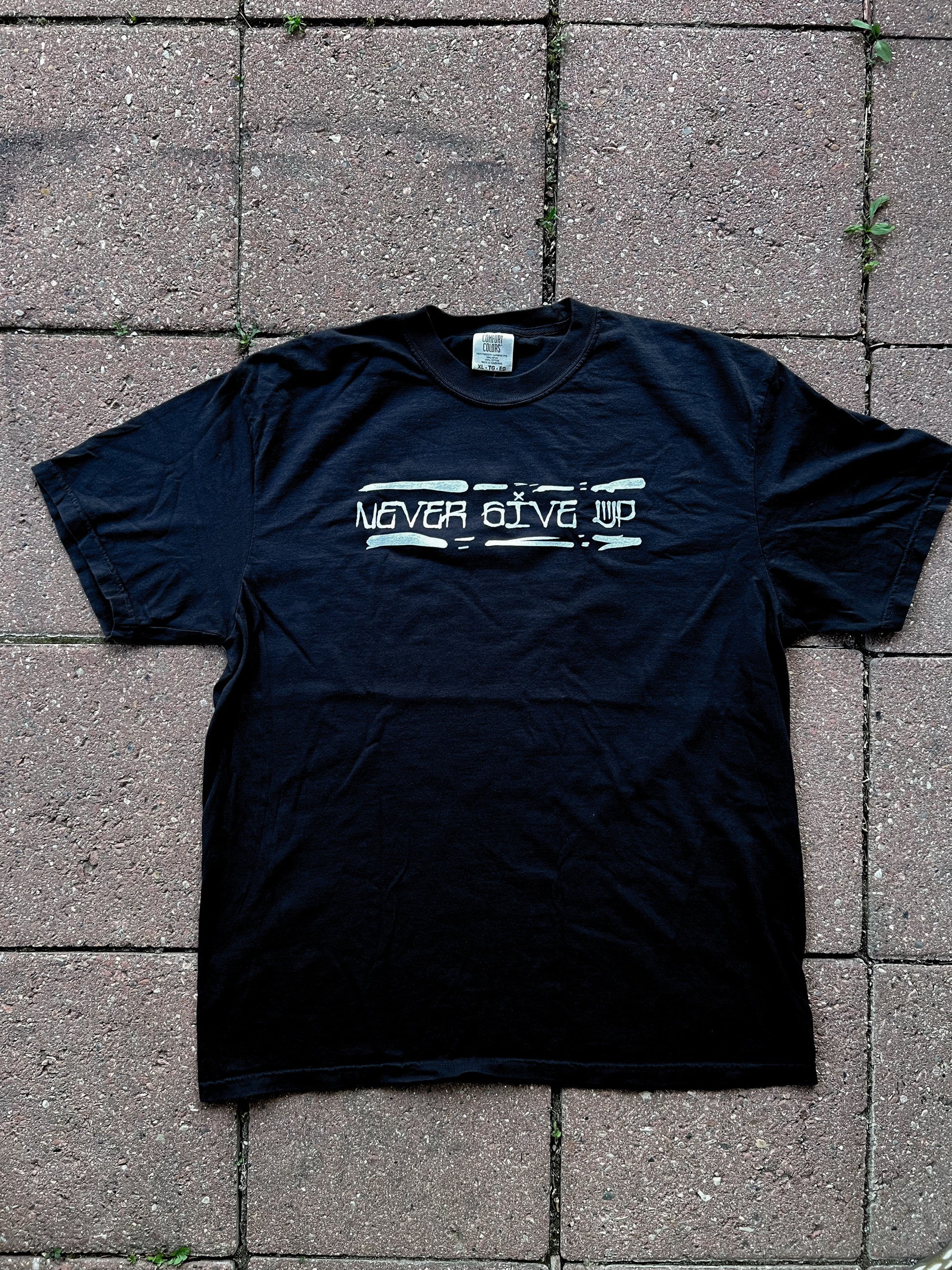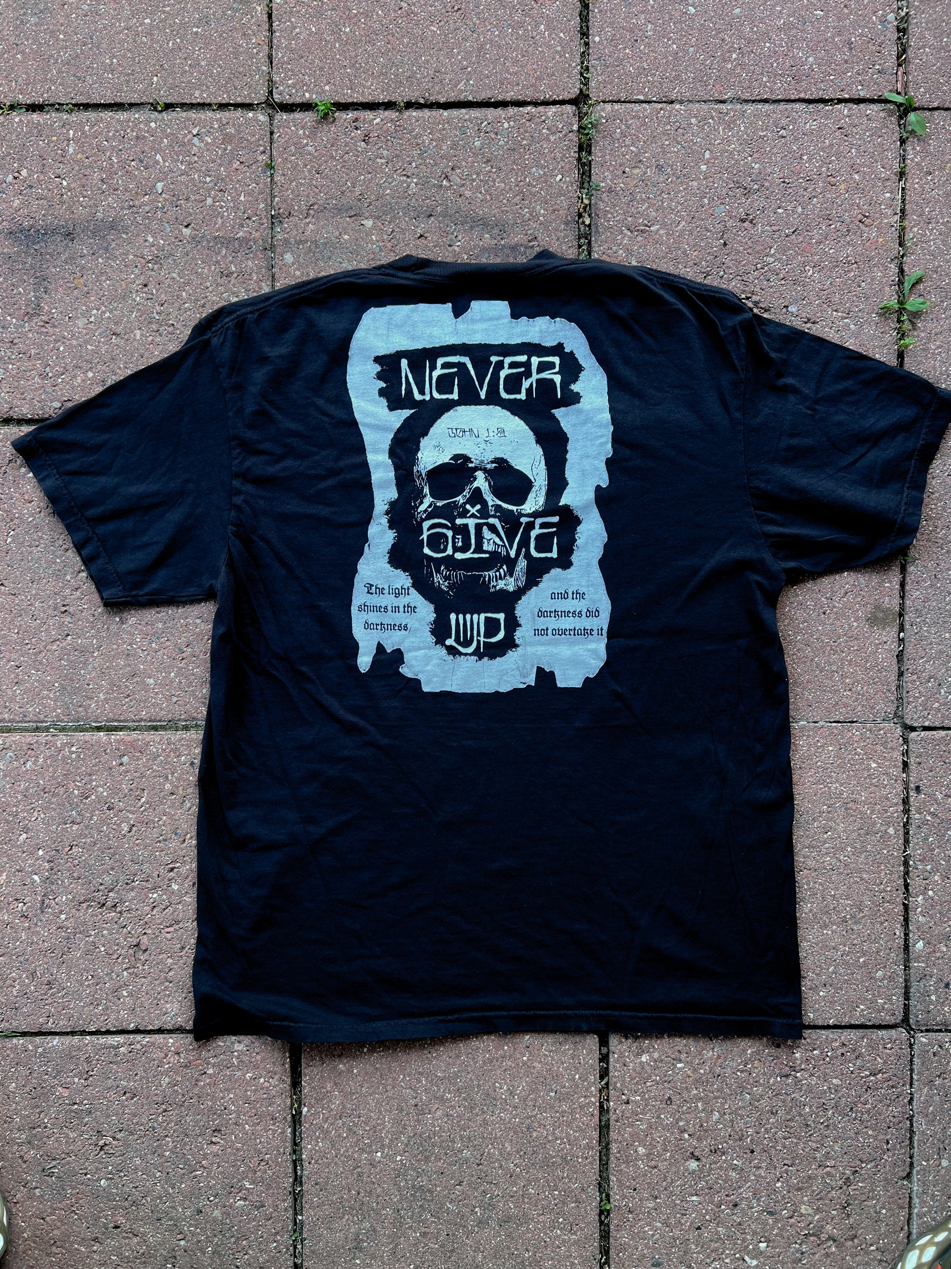 Across the design: “Never Give Up” and John 1:5 — “The light shines in the darkness, and the darkness did not overtake it.”